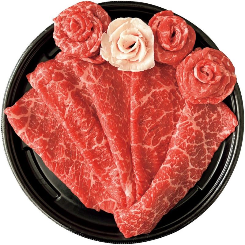 すき焼き用の牛肉と牛脂を花形に仕上げ、ブーケ状に仕立てた牛肉の上に飾りました。見た目も楽しめる贈り物です。