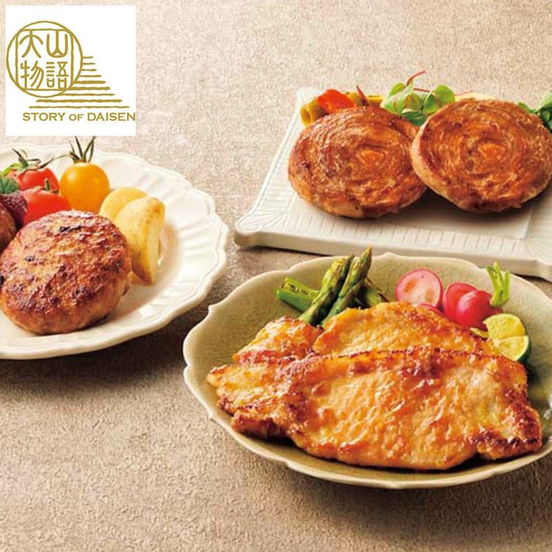 大山豚ロース西京味噌漬100g×3、鳥取和牛×大山豚の手造りハンバーグ100g・大山豚手造りロールステーキ80g×各2