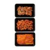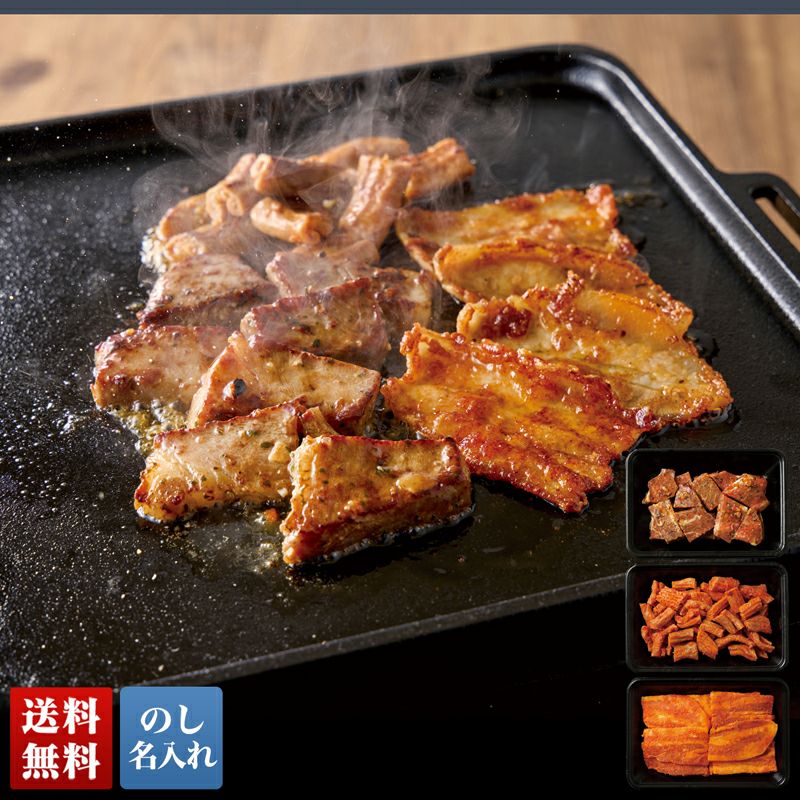 背徳感のある3種の味付けで、国産豚肉の3部位をお楽しみください。肩ロースはバターの香りが漂うガーリックバター醤油味、バラ肉はピリッと辛い博多明太味、ホルモンはにんにくと辛さが絶妙なにんにく辛味噌味です。
