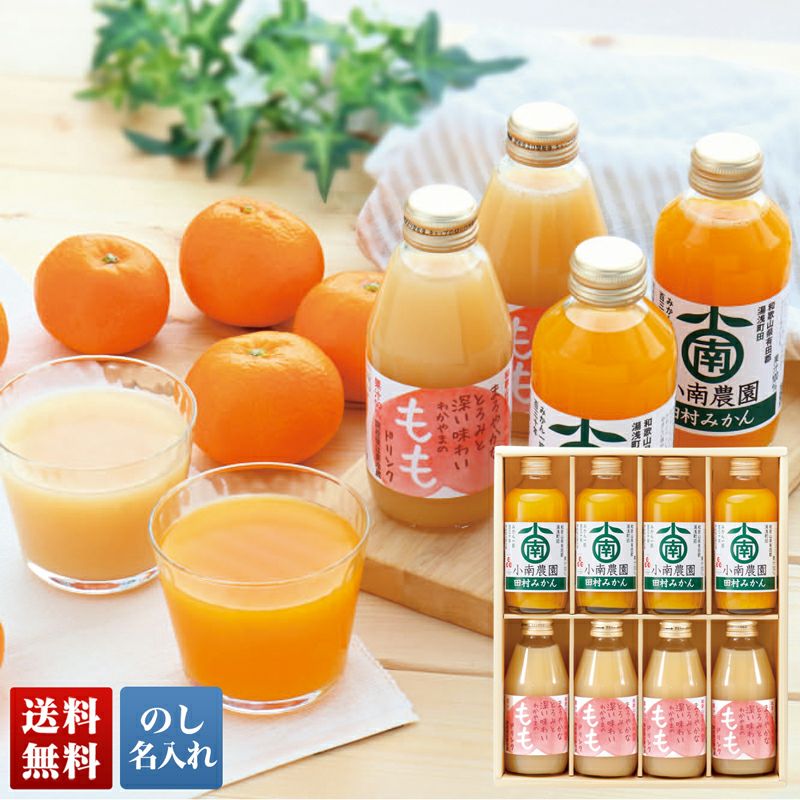 和歌山県産の桃果汁50%のドリンクと和歌山県産みかん果汁100%のストレートジュースの詰合わせです。